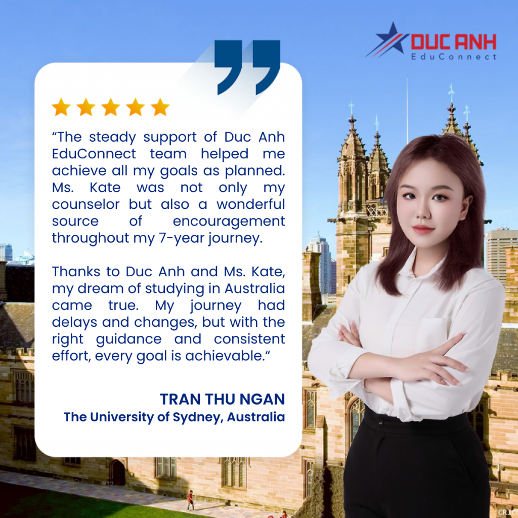 Today, Duc Anh EduConnect is proud to introduce Thu Ngan, now a newly admitted bachelor’s student at the University of Sydney, whose study-abroad dream spanned seven resilient years – a journey defined by setbacks, determination, and quiet perseverance until the day it finally came true.
