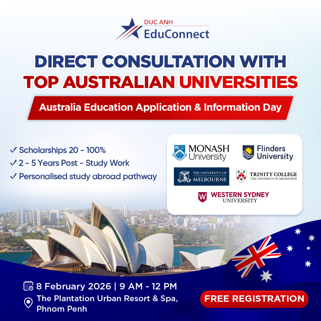 • ការណែនាំពីអ្នកជំនាញ Duc Anh EduConnect: ជាមួយបទពិសោធន៍ជាង 25 ឆ្នាំ Duc Anh EduConnect បានជួយនិស្សិតរាប់ពាន់នាក់ឲ្យចូលរៀននៅសាកលវិទ្យាល័យឈានមុខគេនៅអូស្ត្រាលី និងទូទាំងពិភពលោក។ យើងផ្តល់សេវាកម្មគ្រប់ជំហាន ចាប់ពីជ្រើសរើសវគ្គសិក្សា ដាក់ពាក្យ ចាត់ចែងទិដ្ឋាការ ចុះឈ្មោះចូលរៀន រហូតដល់ការណែនាំអំពីការងារបន្ទាប់ពីបញ្ចប់ការសិក្សា និងផ្លូវទៅកាន់លំនៅឋានអចិន្រ្តៃយ៍ (PR) នៅអូស្ត្រាលី។