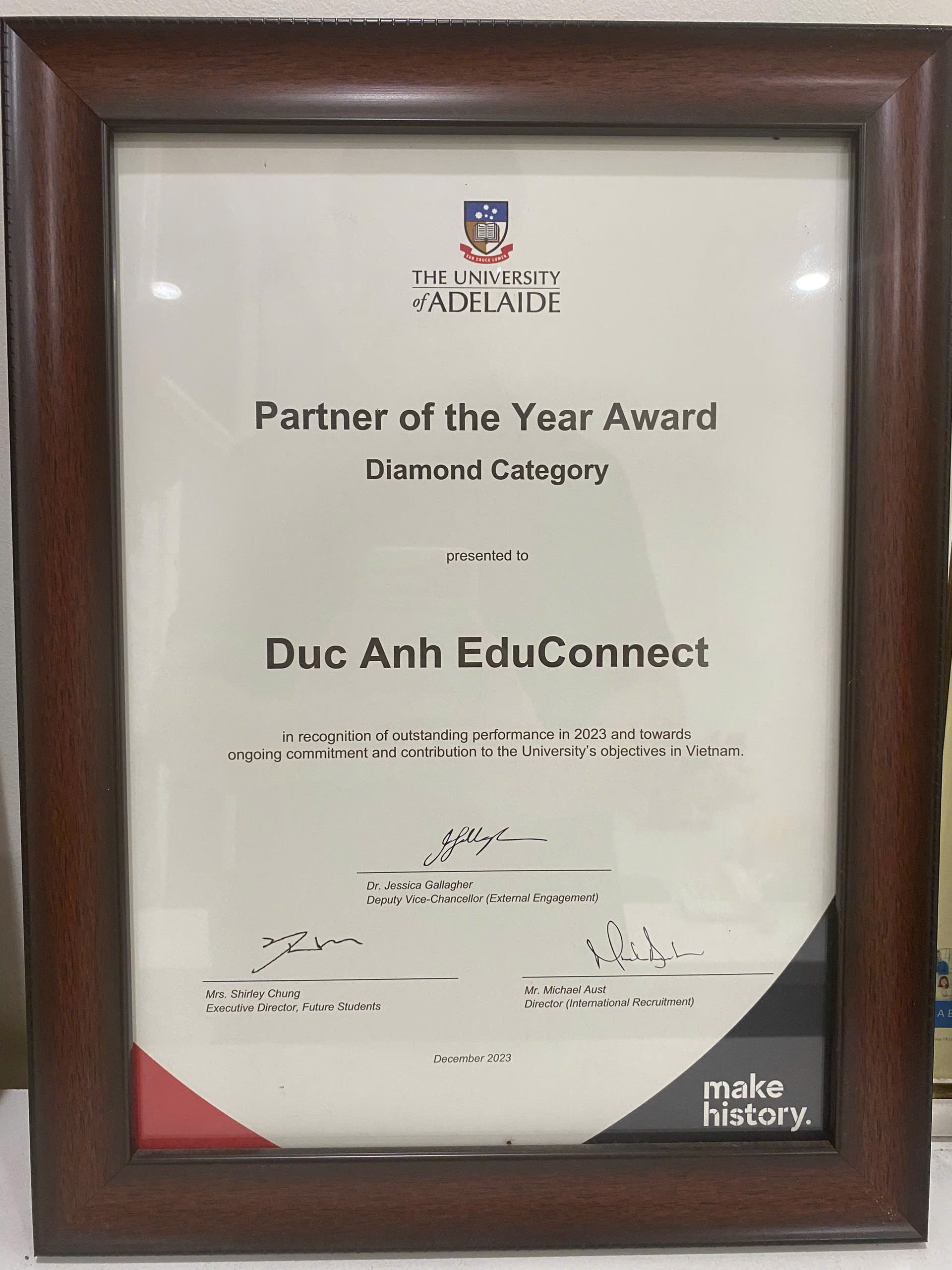 - Awarded the highest title “Diamond Partner of the Year”, 2023 – by the University of Adelaide, Australia;