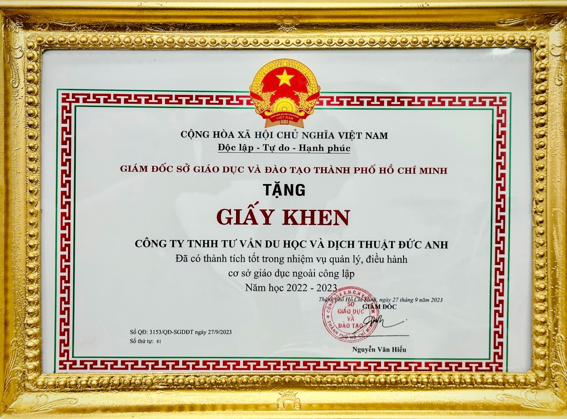 - Awarded the Certificate of Merit for “Excellent Performance in Managing and Operating Non-public Educational Institutions, Academic Year 2022–2023” – by Ho Chi Minh City Department of Education and Training;