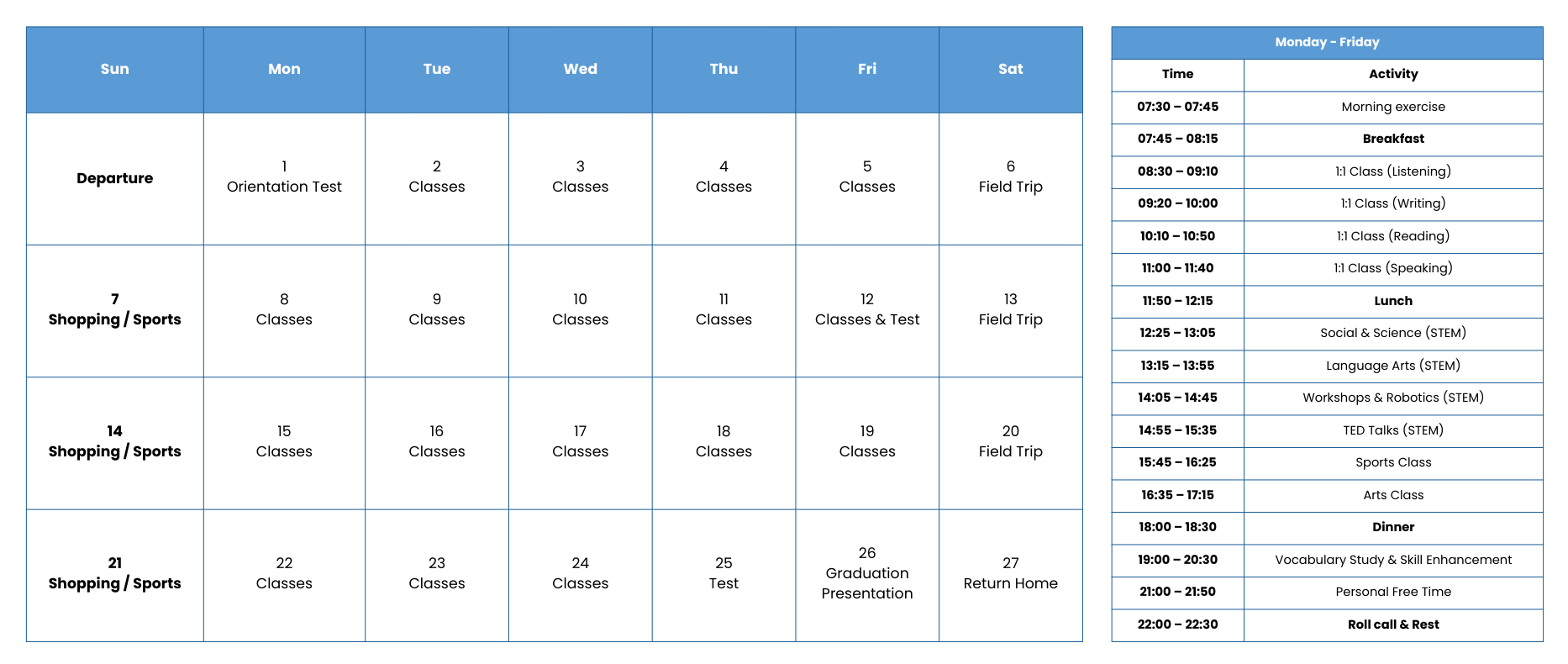 • Evening Classes: Vocabulary review, memory tests, and guided writing practice to reinforce daily learning.