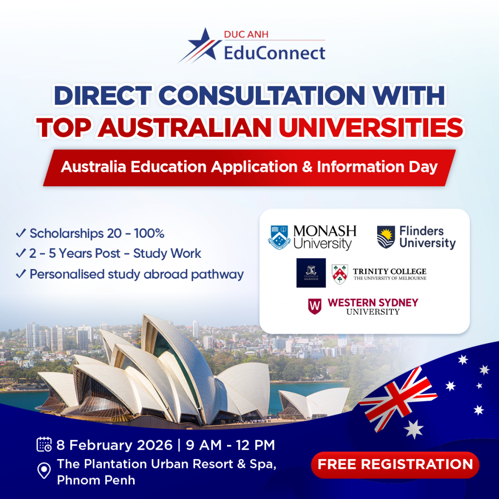 តើអ្នកកំពុងមានគម្រោងទៅសិក្សានៅប្រទេសអូស្ត្រាលី និងចង់ភ្ជាប់ទំនាក់ទំនងផ្ទាល់ជាមួយសាកលវិទ្យាល័យ និងទីប្រឹក្សាអប់រំដែលមានបទពិសោធន៍ដែរឬទេ? យើងសូមអញ្ជើញអ្នកចូលរួមជាមួយ Duc Anh EduConnect ក្នុងព្រឹត្តិការណ៍ពិសេស “Australia Education Application & Information Day” ដែលនិស្សិត និងមាតាបិតា អាចជួបពិភាក្សាផ្ទាល់ជាមួយតំណាងសាកលវិទ្យាល័យអូស្ត្រាលីឈានមុខគេ ដូចជា៖ Monash University – Top 36 លើពិភពលោក & សមាជិក Group of Eight Trinity…