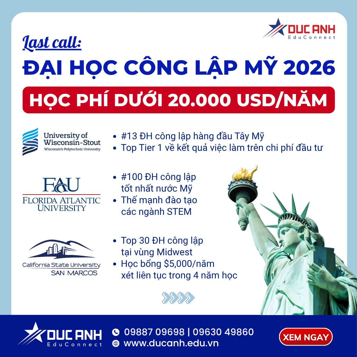 Bạn nghĩ rằng kỳ nộp đơn du học Mỹ mùa Thu 2026 đã khép lại? Thực tế, cơ hội đang mở rộng đến tháng 5/2026 dành cho những học sinh nhắm đến các trường Đại học công lập hàng đầu với mức học phí cực kỳ “dễ thở” (dưới $20,000/năm).