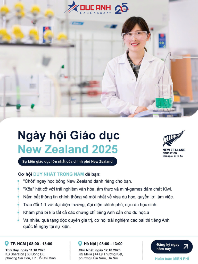 Education New Zealand (ENZ) phối hợp cùng Đại sứ quán và Tổng Lãnh sự quán New Zealand tổ chức Ngày hội Giáo dục New Zealand 2025 – sự kiện giáo dục lớn nhất trong năm, quy tụ gần 50 trường trung học, cao đẳng, đại học và sau đại học hàng đầu New Zealand.
