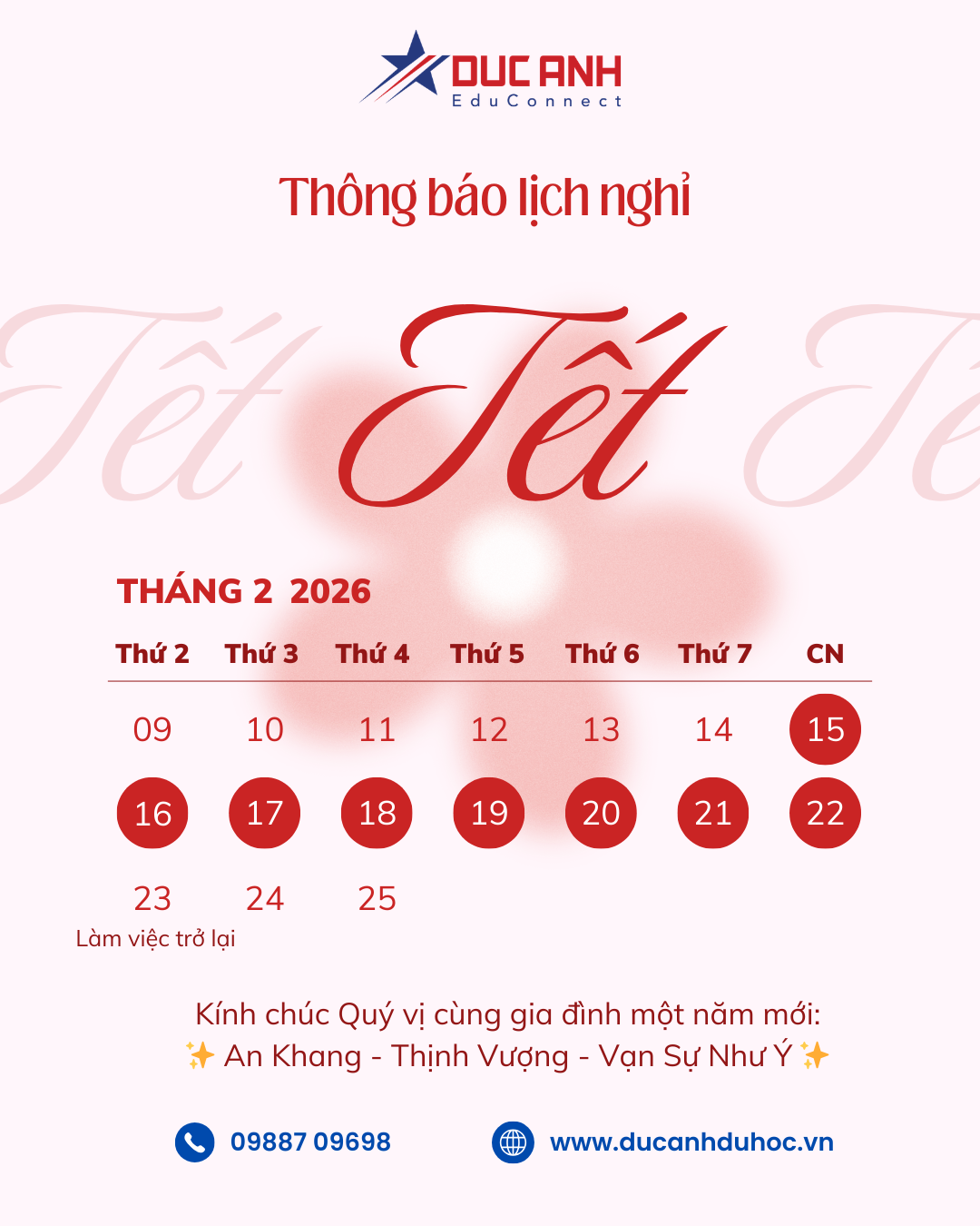 Nhân dịp Năm mới 2026, Công ty Tư vấn du học Đức Anh xin gửi lời cảm ơn chân thành tới Quý khách hàng và Đối tác đã đồng hành và ủng hộ công ty trong thời gian qua. Chúng tôi hy vọng sẽ tiếp tục nhận được sự tin tưởng của Quý vị trên bước đường phát triển sắp tới.