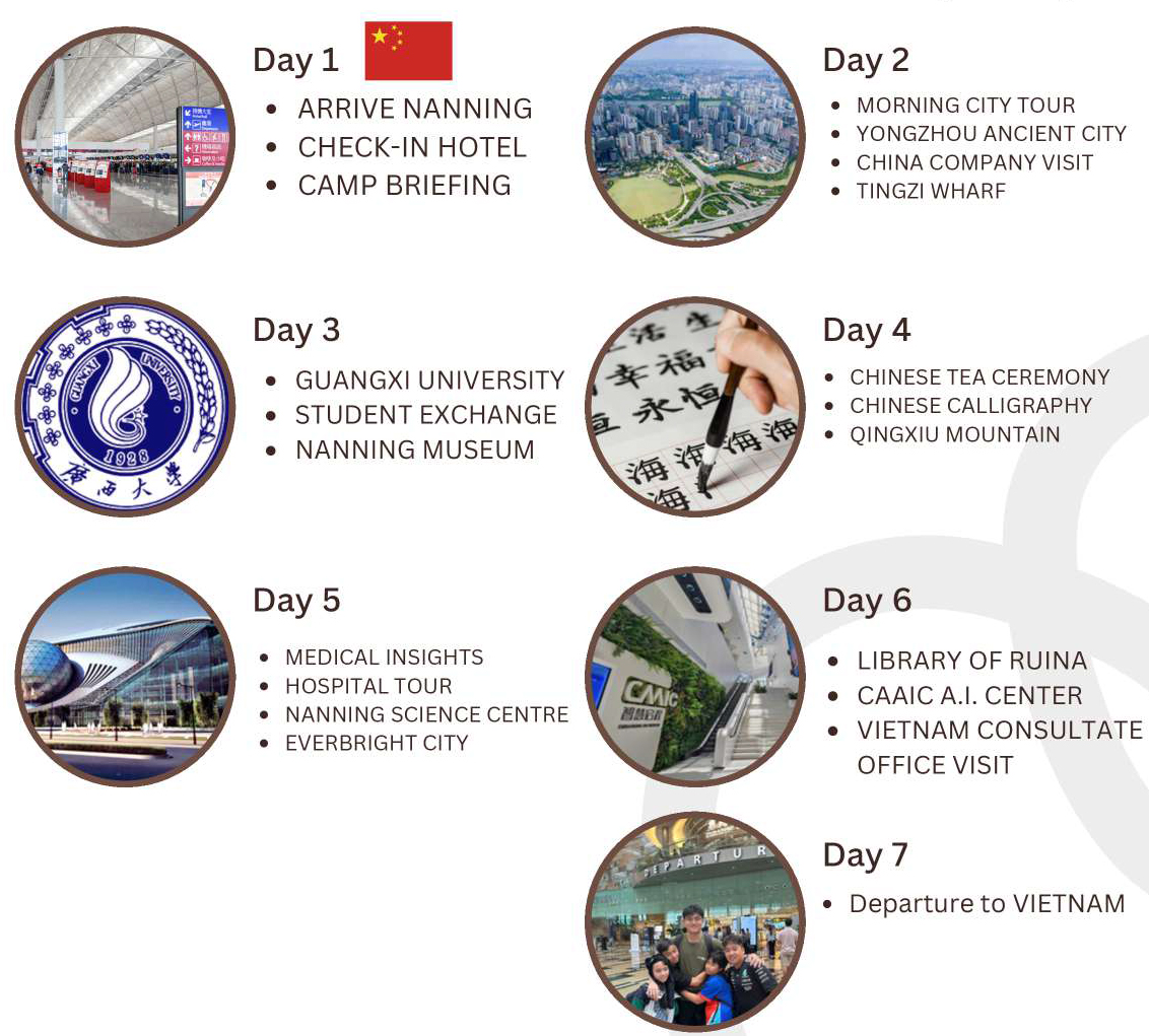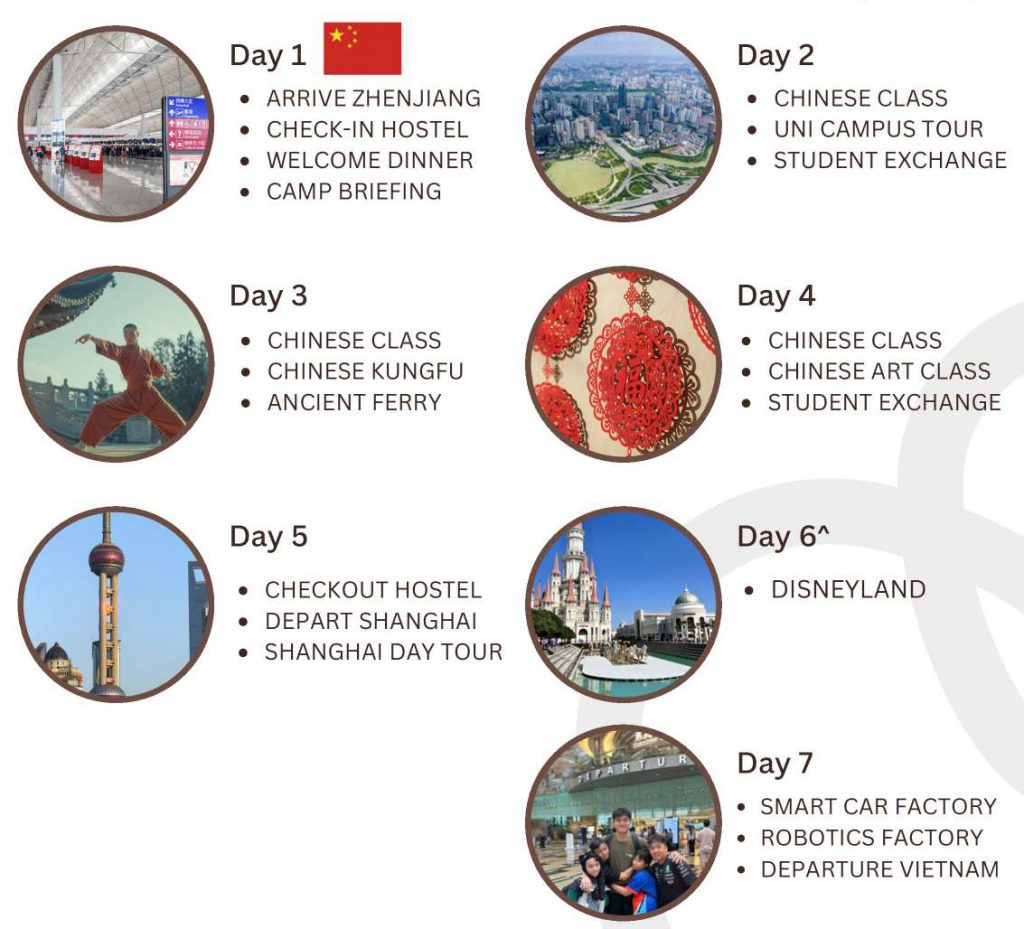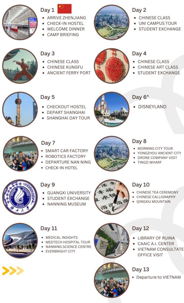 Từ Thượng Hải sôi động, Trấn Giang cổ kính đến Nam Ninh năng động, các em sẽ được học tiếng Trung trực tiếp, giao lưu sinh viên tại các trường đại học danh tiếng, tham gia lớp Kungfu, thư pháp, nghệ thuật dân gian, và trải nghiệm nghi lễ trà truyền thống Trung Hoa.