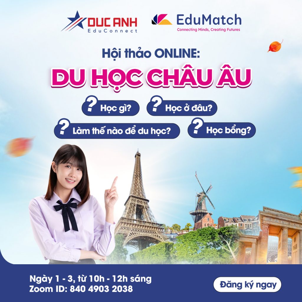 Thế nên, nếu bạn quan tâm du học châu Âu, EduMatch – Đức Anh EduConnect tổ chức Hội thảo online chuyên đề DU HỌC CHÂU ÂU nhằm giúp học sinh và phụ huynh tối thiểu hóa chi phí – tối đa hóa lợi ích du học. Sự kiện được thiết kế riêng cho những “thợ săn” du học & học bổng đang tìm kiếm giải pháp du học thông minh nhất năm 2026.