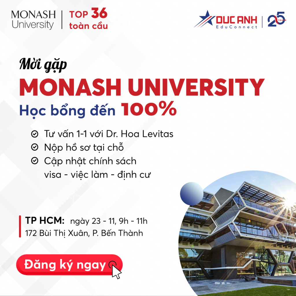 Đây là cơ hội ĐỘC QUYỀN để nhận tư vấn chuyên sâu từ Tiến sĩ Hoa Levitas, Giám đốc cao cấp khu vực Đại học Monash và Đức Anh EduConnect- công ty tư vấn du học đã giúp hàng ngàn sinh viên giành học bổng CAO NHẤT- DUY NHẤT, trong đó có 2 sinh viên người Việt xuất sắc đạt HỌC BỔNG 100% Monash Leadership siêu quý siêu hiếm hiếm (mỗi năm chỉ cấp 4 suất trên toàn cầu).